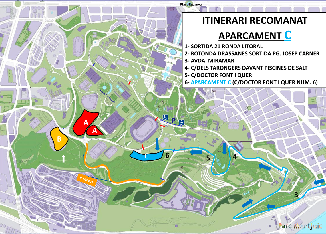 Due to mobility restrictions in Montjuïc, private cars will not be allowed access unless they have a parking reservation (subject to availability). The only access to the parking areas is via C/del Foc.